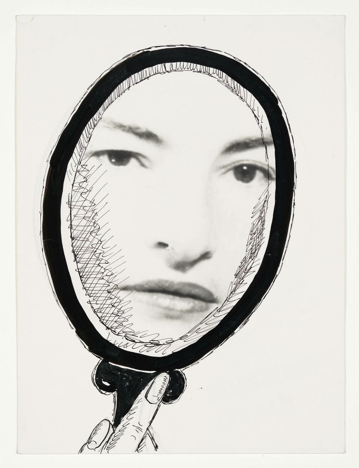 Upon first glance, Juliet appears to be staring at the spectator. Her eyes seemingly gaze directly at you. The sharpness of her glance is obscured by the edges of the reflection of light, revealing that what the photograph presents is merely representative of what appears from a mirror. Her indifferent expression is completely cropped by the object, capturing her gaze like the camera did prior to development. But beyond the mirror’s “reflection,” is there anything else she could be glancing at besides the photographic device that her husband–the artist himself– used to initiate this moment? The mystery of her stare embodies the surreal addition of the drawing, adding another dimension to the image, making this multimedia creation, beyond a typical photograph of a woman dear to his heart. As the print is progressively obscured by the inclusion of the mirror, it only makes the spectator more immersed in her look upon them, supposedly peering below them as she belongs to a reality above.